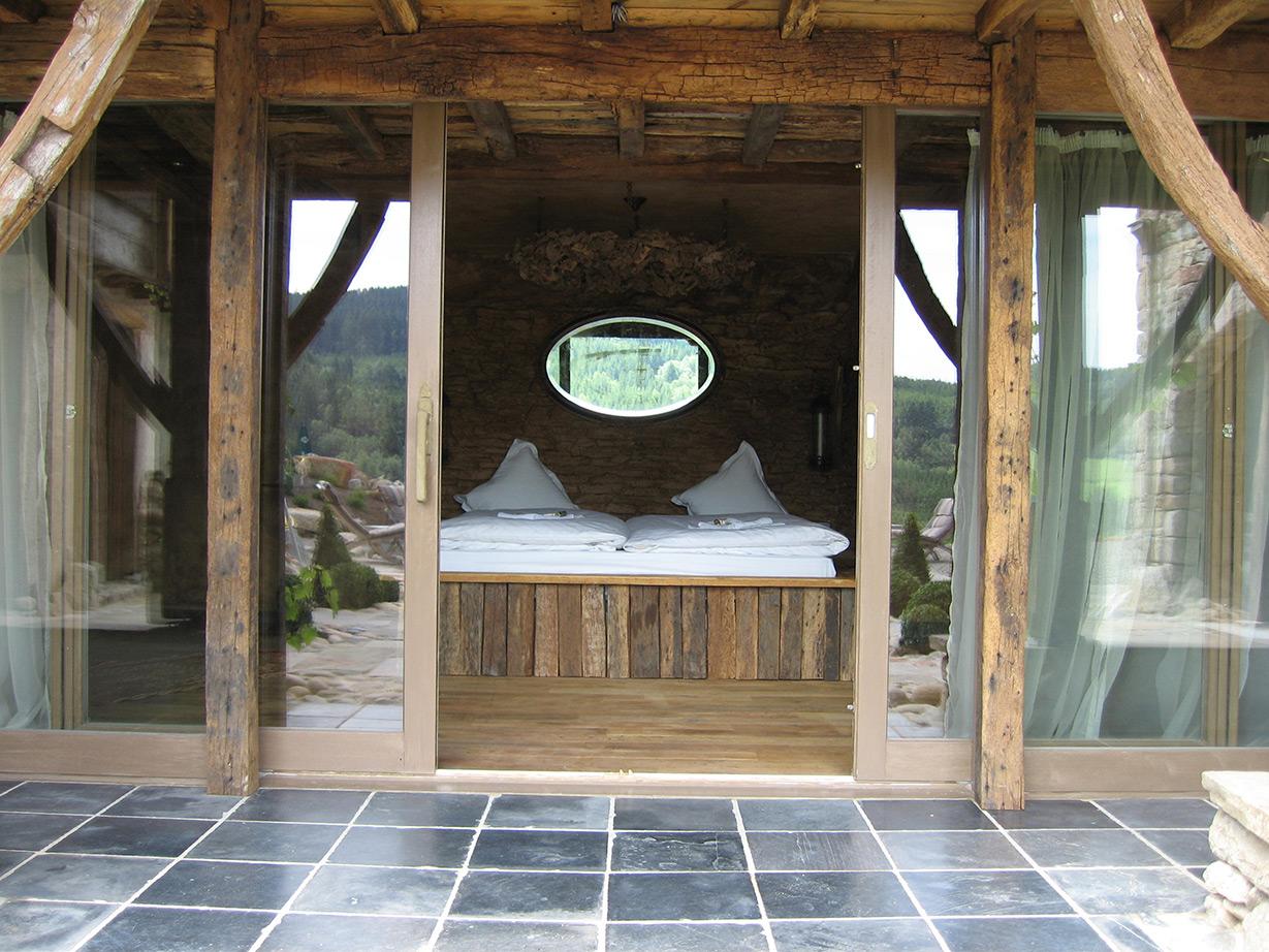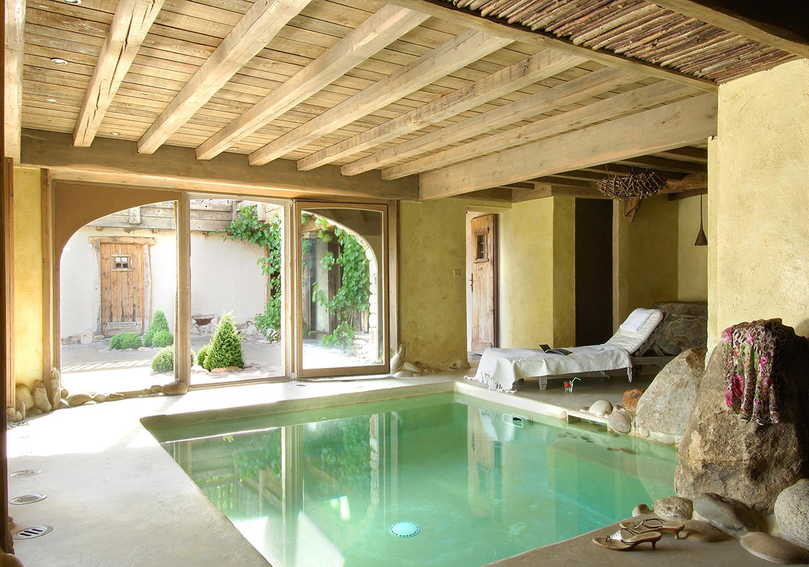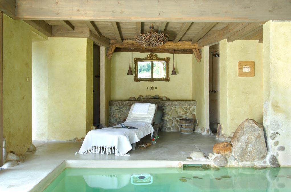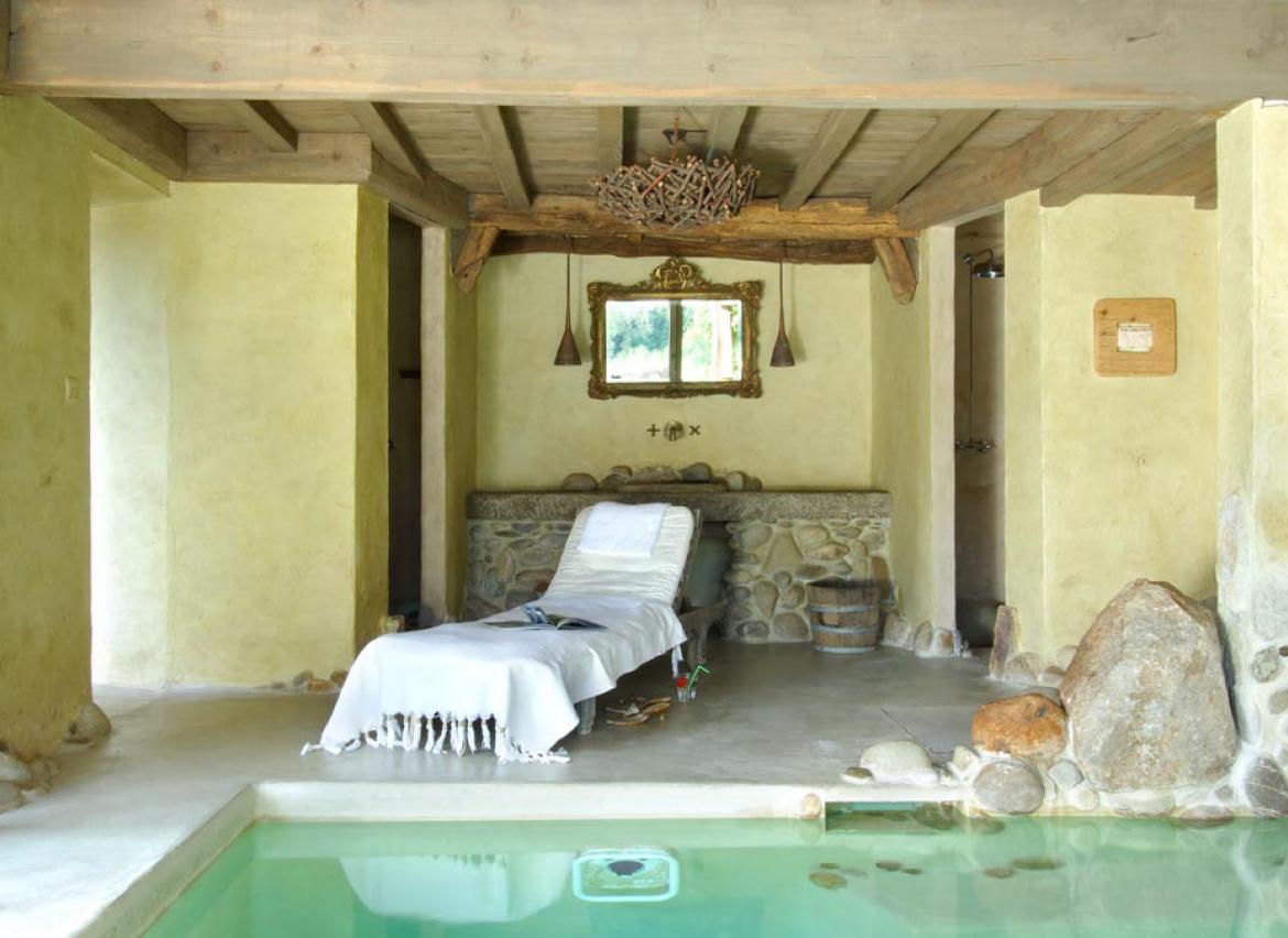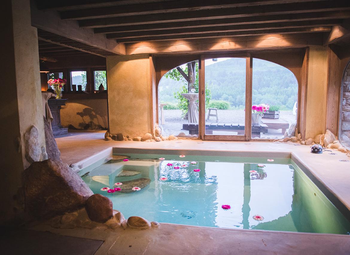 - Espace détente intérieur : piscine, douches, coin de relaxation et espace bar avec pompe à bière